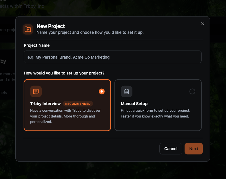 Creating a new project now starts with a choice. You can have a conversation with Trbby to figure out your setup, or jump straight into a form if you already know what you need. Both paths cover the same ground: goal, voice, about, audience, and topics.