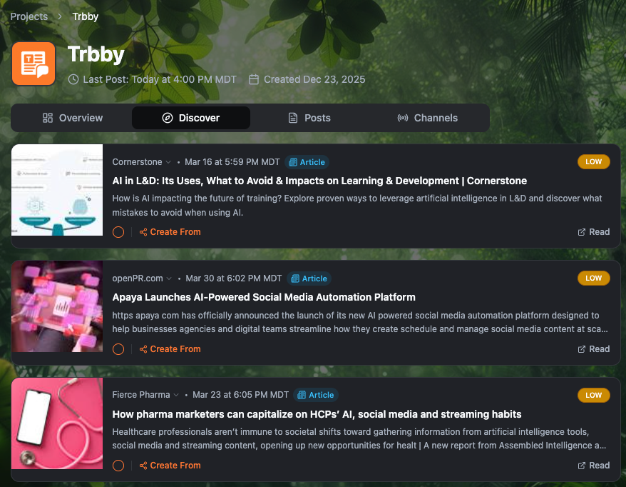 You can now control what Trbby surfaces in your Discover tab. Discovery Settings in Project Preferences give you direct control over the topics Trbby searches, the type of content it finds, and the sources it pulls from.